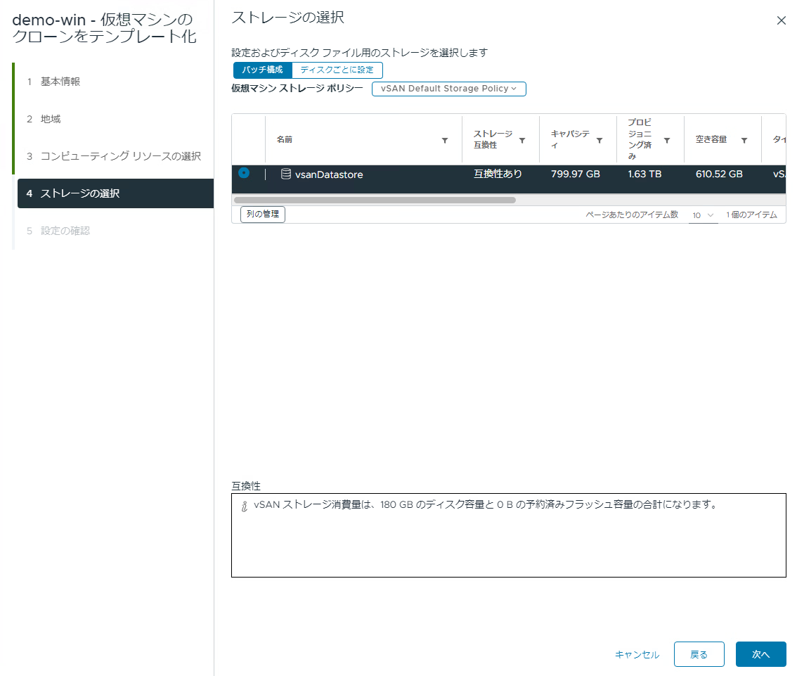 コンテンツライブラリを配置するデータストアを指定して「次へ」をクリックします。